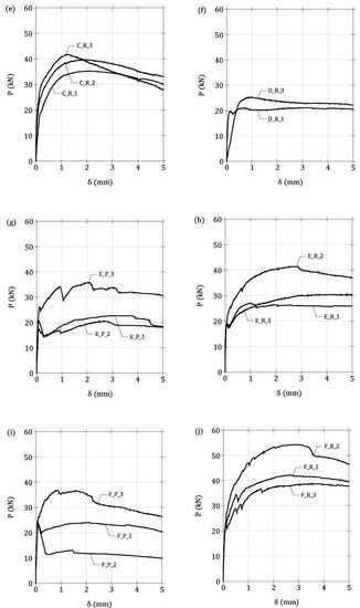 Specifically, Figure 10a represents the curves of the LRC beams cast with mixture A, whereas the curves of the beams containing short fibers (i.e., mixtures B and C), with and without rebar, are shown in Figure 10b–e. Similarly, Figure 10f illustrates the P-δ curves of the LRC beams made with the mixture D, and in Figure 10g–j the mechanical responses of the beams containing long fibers (i.e., mixtures E and F), with and without rebar, are shown.