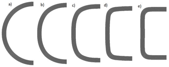 In order to determine the distributions and values of plastic deformations and residual stresses prevailing in the pipe after the cold shaping process, we constructed a numerical model of the cold profiling process. The starting material was a round pipe with an external diameter (d = 30 mm) and a wall thickness of 2 mm, made of S235JR constructional steel, which was profiled to obtain a 25 × 25 × 2 mm square pipe. Due to the fact that the pipe length did not change during profiling, the profiling analysis was carried out in a flat deformation state. Due to the occurrence of plane symmetry, the numerical model was made for half of the cross-section. The shaping tools were modelled as perfectly rigid. Quad 4 elements type 11 were used to discretize the deformable body [21]. In order to improve the behavior of these elements during bending, an additional interpolation function was applied during the assumed strain procedure [21]. An elastic–plastic model of the pipe material with non-linear strengthening described by the Hollomon power equation was adopted. Isotropic properties of the pipe material were assumed for both elastic and plastic deformations. The strain curve was introduced into the program in a tabular form. The entered coordinates of the strain hardening curve were calculated on the basis of the pipe material parameters, which were determined on the basis of the uniaxial tensile test: Re = 388 MPa, Rm = 486 MPa, C = 530 MPa, and n = 0.044. To describe the friction between the tools and the profiled pipe, we used the Coulomb friction model with a friction coefficient of 0.1. Numerical modelling was performed using a commercial MSC.MARC/Mentat system, which is considered one of the most advanced programs for FEM analysis, and particularly for modelling nonlinear and contact issues. The change in the shape of the cross-section during pipe shaping is shown in Figure 3. The input material is a pipe with a circular cross-section (Figure 3a), which in the technological process is constructed by longitudinal rolling. Such a pipe is also formed by longitudinal rolling and, in subsequent stages, it takes intermediate shapes (Figure 3b–d) until the required square section is obtained (Figure 3e).