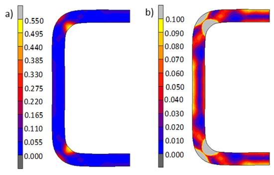 As is commonly known, the properties of elements formed via cold working are significantly affected by the strain hardening phenomenon, which is when a material’s formability is reduced. Figure 4 shows the distribution and values of the total equivalent plastic strain in the pipe material after shaping. The highest values of plastic strain occur in the corners, especially in the area of the internal radii, where their calculated values reach 0.55 (Figure 4a). Quite significant material hardening points are also deformations in other areas of the material. The inequality of the distribution of plastic strains on the cross-section of the pipe is even more evident when deformations are smaller than 0.1, as shown in Figure 4b.