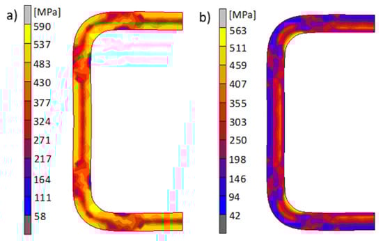 The second important parameter that has a significant impact on the properties of components shaped via cold forming are residual stresses that prevail in the material after the technological process [16]. Residual stresses are the result of heterogeneous plastic deformations in the material after its formation. The greater the heterogeneity and gradient of plastic deformations, the higher the material stress values, which may be close to the yield point in accordance with the course of the strain curve. Figure 5a shows the distribution and values of Huber–Mises equivalent stresses in the final shaping phase are shown in Figure 5a, while Figure 5b shows the distribution of these stresses that prevail in the material after the technological process. As can be seen, the largest values of equivalent stresses occur in the areas of the largest deformation gradients and amount to about 590 MPa in the final shaping phase. In turn, the residual stresses in this area reach the highest value of about 563 MPa, i.e., only slightly lower (about 27 MPa) than the yield point. Both plastic deformation and own stress have a significant impact on the material after the technological process. As demonstrated after the cold pipe profiling process, their share is significant. For this reason, we carried out an analysis of the impact of these parameters for a square pipe bending process.