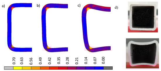 Figure 7 and Figure 8 show a comparison of the changing cross-sectional shape of the bent beam and the distribution and values of plastic deformations for Model A and Model B respectively. Taking into account technological deformations and residual stresses created when cold shaping a square pipe (model A), results had a much greater degree of deformation in the pipe’s cross-section than when we did not take into account the impact of technological deformations and internal stresses created during the shaping (model B). Photographs of the pipe cross-sections before and after the bending process (Figure 7d) confirmed the above mentioned statement. The shape and size of the deflection of the cross-section walls observed in the experimental sample photograph were similar to the image of the cross-section obtained via numerical modeling, which considered technological deformations and residual stresses created when cold shaping a square pipe (model A).