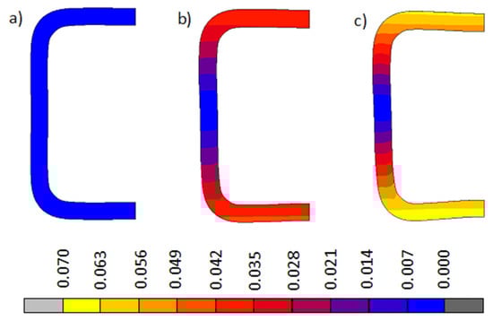 Change in cross-sectional shape of the bent beam (model B) and distribution of total substitute plastic deformations for: (a) 1/R = 0 m−1, (b) 1/R = 4 m−1, and (c) 1/R = 6 m−1.