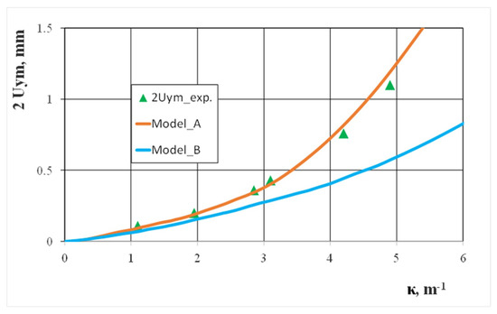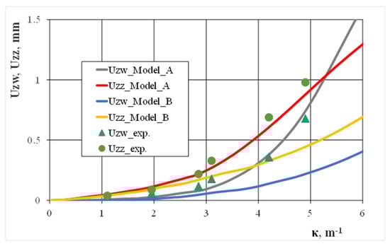 With the measurements results carried out during the experimental studies, we compared numerical calculations for the displacement values of selected points in the profile cross-section, which occurred during a curvature increase. If the horizontal walls deflection degree internally and externally changed, good compliance of the calculation and experimental results were obtained (Figure 9). However, this was only when we considered technological deformations and residual stresses created when cold shaping a square pipe (model A). Similarly, large differences between the numerical calculation results and experimental results were found when we analyzed the degree of the vertical wall bending (Figure 10). This was because it did not take into account the technological deformations and stresses created when cold shaping a square pipe (model B). During experimental bending tests, we observed that bending the pipe above the curvature κ > 6.0 caused a localization of the deformation on the internal horizontal wall and led to the pipe’s local collapse. The above observation was confirmed by the numerical calculation results carried out according to model A, which indicated an intensive increase in the deflection of the internal horizontal wall for large bending curves. The location of the deformation in the pipe cross-section resulted in its buckling and caused a significant share of compressive stresses. It should be noted that deflecting the vertical walls in the profile cross-section slightly affected the moment of inertia value, which is what determined the bending moment value.