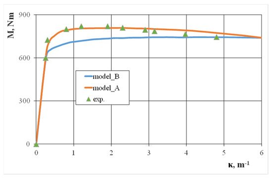 As expected, the improved modelling of the numerical degree of distortion for the bent square tube’s cross-section had good compliance with the bending curve, which was experimentally determined via numerical calculations (Figure 11). This occurred during technological deformations and residual stresses after making a square tube from a circular tube via the cold forming process (model A). The bending characteristics that were determined numerically in accordance with the assumptions for model B differed from the bending characteristics determined experimentally, especially in the small bending curvature area. Only in the bending curvature range of κ > 3.0 m−1 were the bending moment values numerically calculated. Over the wide range of bending curvatures, the bending moment values did not change much, which was partially a result of the pipe material’s slight strain hardening. On the other hand, even a slight strain hardening should increase the value of the bending moment. At the same time, the decrease the cross-section’s moment of inertia value was a result of the walls deflecting, especially the horizontal ones, which completely eliminated the deformation strengthening effect. For bending curvatures κ > 6.0 m−1, the pipe collapsed locally, which was accompanied by a sharp drop in the bending moment value.