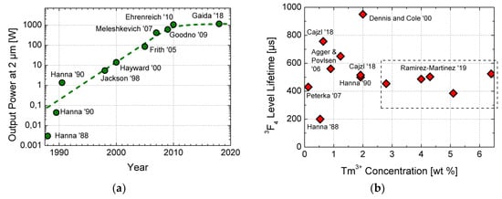 Power evolution with time in Tm-doped fiber lasers (a) and one of the key spectroscopic characteristics of Tm-doped fibers, the lifetime of the upper laser level 3F4 vs. thulium concentration (b). Selected results are presented in both schematic figures, the respective reference numbers [14,15,18,19,20,21,22,23,24,25,26,27,28,29,30] are shown next to the graph points.