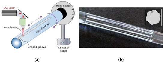 - Jasim, A.A.; Podrazký, O.; Peterka, P.; Todorov, F.; Honzátko, P. Experimental investigation and characterization of fabrication shaped clad optical fiber by thermally polishing optical fiber preforms with CO2 laser. In Proceedings of the SPIE 11029, Micro-structured and Specialty Optical Fibres VI, Bellingham, WA, USA, 16 April 2019; p. 1102909. [Google Scholar] [CrossRef]