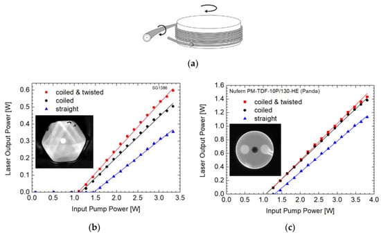 (a) Scheme of simultaneous coiling and twisting of the fiber; Laser characteristics under the conditions of straight, coiled, and coiled and twisted: (b) fiber with hexagonal shape of the inner cladding; (c) Panda fiber.