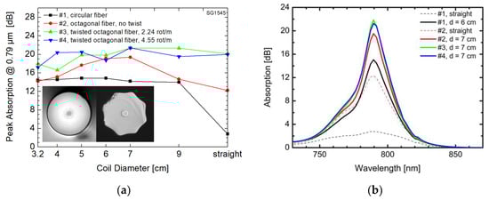 Although the shape of the inner cladding cross section indeed affects the pump absorption, see for example, the study of inner claddings with periodic perturbation of their outer shapes [66], we showed that the effect of unconventional coiling on pump absorption is stronger than the effect of the inner cladding shape as long as its circular symmetry is broken. We measured separately the spectral absorption of a 2-m long pieces of all four fiber samples at around the wavelength 0.79 µm for straight condition as well as for different coiled conditions (the fiber was coiled on cylindrical spools with different radii). The peak absorptions for the four fiber samples are presented in Figure 4a where the lines between the experimental points are used for better representation of the trends only. Each point in Figure 4a represents one spectral absorption measurement for the given fiber sample under certain coiling condition. Some of the measured absorption spectra (corresponding e.g., to straight or to coiled fibers on cylinder with optimal diameter reaching peak absorption values) are compiled together in Figure 4b for better illustration. The same colors of the lines are used in both Figure 4a,b to represent those four different fiber samples. The twisting effect on the peak absorption could be seen in Figure 4a for straight octagonal fibers where the peak absorption of 12 dB for untwisted fiber (red color) was increased to 20 dB by twisting (green and blue colors). The pump absorption can be further improved for untwisted fiber (red color) by its coiling and there is apparently a local maximum of absorption for the coil diameter of about 7 cm. It is in accordance with pump field squeezing and decentering effects theoretically predicted by numerical models [62,63]. The circular fiber (black color) had poor peak absorption of less than 3 dB for straight condition, as expected, and it can be improved to about 14 dB by coiling the fiber.