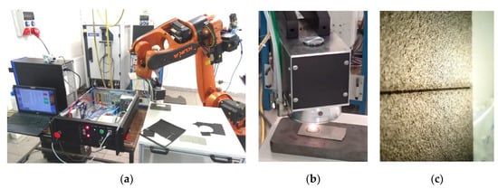 (a) Thulium all-fiber laser material processing testing workplace with robotic arm; (b) Detail of the laser head during cutting of synthetic leather with thickness of 1 mm; (c) Detail of a cut in SBR (Styrene Butadiene) rubber material.