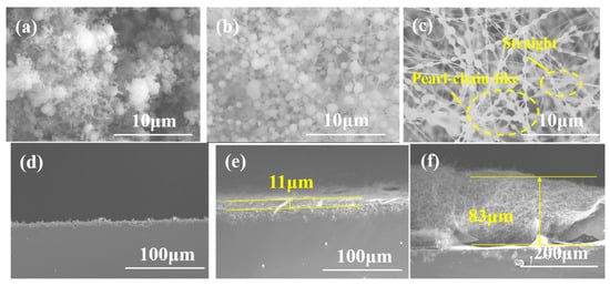 Surface morphology SEM images of (a) N1, (b) N2, (c) N3 SiC nanowires, Cross-section morphology SEM images of (d) N1, (e) N2, (f) N3 SiC nanowires.