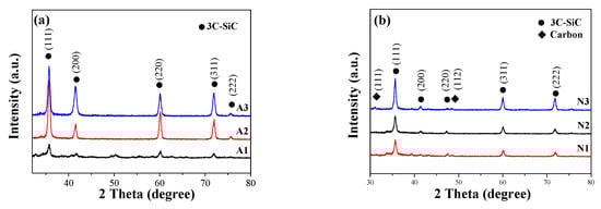 As illustrated in Figure 3a, all three samples showed typical diffraction peaks for 3C-SiC. When the thickness of Al2O3 is 2 nm, the characteristic peak strength of SiC is extremely weak. As the thickness of the Al2O3 catalyst film increases, the characteristic peaks of SiC gradually become sharp and clearly visible. This indicates that the catalyst increases, the amount of nanowires is larger or the crystallinity gradually increases. In Figure 3b, the typical diffraction peaks of SiC are displayed even at the lower thickness of the Ni film. However, the peaks become sharper as the thickness of the Ni film increases. To note, for the N3 sample, traces of C can be observed in the XRD pattern. The comparison of the crystallinity of samples reveals that a crystallization degree of 22.3% is obtained for the N3 sample, which is made of crystallites of 14.3 nm, whereas a crystallinity degree of 35.6% is determined for the A3 sample, consisting of crystallites of 21.1 nm (Table 1). This result is consistent with the SEM result. The sample with Al2O3 as catalyst has a larger diameter, so the overall crystallinity is higher. This is because the semi-liquid catalyst in the OAG growth mechanism is only attached to the surface of SiC nanowires, and the limiting force on the diameter of nanowires is weaker than that on the tip of the nanowire droplets in the VLS mechanism.