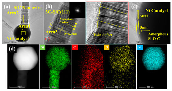 As can be seen from Figure 6a, Ni catalyst is placed on the top of SiC nanowires, which is a typical feature of VLS mechanism [,,]. This indicates that N1, N2 and N3 have grown according to the VLS mechanism [,]. The Ni catalyst controls the growth of SiC nanowires in the (111) direction. As shown, the average diameter of nanowires is 50 nm (Figure 6b). Many twin defects can be observed inside the nanowires, and a periodic sawtooth-shaped crystal structure of the SiC nanowires is noticed on the surface. As can be seen from the elemental analysis in Table 3, the catalyst droplet mainly contains 77.76% Ni and a small amount of Si, C and O on the surface. The elemental composition of single crystal nanowires is mainly Si and C with atomic ratios close to 1:1, and O with 2.38%. The amorphous layer coated on the surface of nanowires is mainly C. The SAED pattern shown in the illustration in Figure 6b shows a single crystal lattice. The high-resolution image magnified in red circles shows defects in nanowire growth, such as twin defects. The high-resolution image in Figure 6c shows that the diameter of the Ni catalyst droplet is about 200 nm. The surface of the droplet is covered by an amorphous layer of Si–O–C with a thickness of 5 nm. The EDS spectrum of N3 shows that the catalyst droplets on the top of the nanowires are composed of Si, C, O, and Ni, whereas the Si–O–C mainly exists on the surface of the catalyst droplet (Figure 6d).