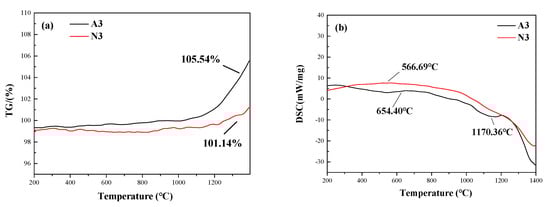 The TG curves show no change before 1100 °C. However, above 1100 °C, a weight gain is observed for both samples, indicating that the SiC nanowire sample is further oxidized. The oxidation is more evident for the A3 sample, of which the residual mass is 105.54% (Figure 9a). In this case, the sample contains Al with a lower melting point (660 °C), while the content of amorphous Si–O–Al is high and easily oxidized, which is reflected by the weight gain. N3 samples showed a relatively low rate of mass change. This is because the excess carbon in the PCS precursor is consumed by the trace of oxygen, forming a thin amorphous layer of carbon on the surface of the nanowire []. It can be observed from the TEM image that there is an amorphous carbon layer on the surface of SiC nanowires, and the oxidation of the amorphous carbon layer will consume and result in weight loss. Meanwhile, the weight gain and mass cancellation of the amorphous crystallites and Si–O–C occur during the oxidation process. N3 shows absorption peaks at 566.69 °C, while the adsorption peak of A3 appears at 654.40 °C (Figure 9b). In addition, a peak appears at 1170.36 °C, likely due to the introduction of Al. Therefore, the thermal stability of the oxidizing substance has a great influence on the thermal stability of the nanowire at high temperatures.