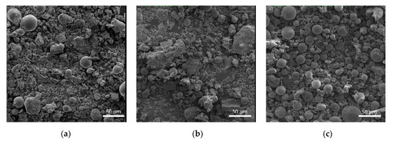 Micrographs of the fly ash products. (a) FA1; (b) FA2; (c) FA3.