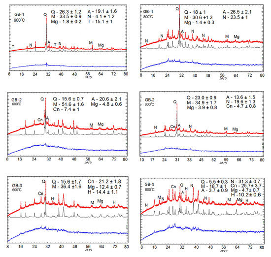 The XRD pattern of the alkali-activated binders detected the transformation of mullite and quartz, into anhydrous crystals with a network structure such as Na-alumosilicates (nepheline) and (Ca-Na)-alumosilicates (anorthite, cancrinite) at the temperature range of 25–800 °C, as depicted in Figure 3. Aluminosilicate phases cancrinite and anorthite are formed first, within a lower temperature range starting from 25 °C and higher. Further temperature increase stimulates an intensive transformation of low-temperature phases such as sodium hydrocarbonate (Na3(HCO3)(CO3)·2H2O) or trona to high-temperature crystalline mineral phases such as nepheline. Trona is a reagent used for binding sulfur trioxide in flue gas during the coal combustion process. The concurrent disappearance of peaks that define trona phases and emerging new peaks indicating nepheline presence serves as an example of such transformations. Here, for the GB-1 specimens, the formation of nepheline phase was detected at 600 °C and for GB-3 and GB-2, the XRD peaks indicating nepheline or other like phase was observed only after 800 °C of thermal exposure (Figure 3).