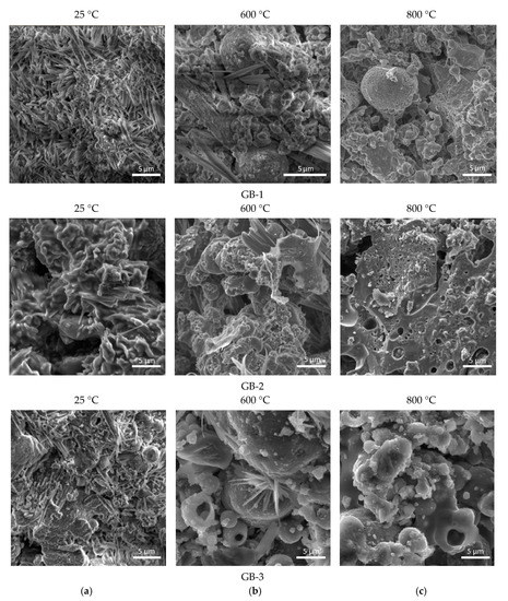 Among all studied alkali-activated binders, the GB-1 specimens had the highest initial content of needle-like crystals of sodium carbonate hydrate phase in the composition (Figure 4a), and with a temperature increase transformed to amorphous substance to nanosized crystalline alumosilicate phases of nepheline, as has also been reported by other authors [18,22,38]. For all alkali-activated mixes, an increase in temperature to 600 °C and 800 °C allowed for better solubility of alumosilicate component in alkaline media, and therefore the formation of an additional vitreous phase that contributed to the formation of a denser matrix. The SEM micrographs of the GB-2 and GB-3 specimens after thermal exposure at 600 °C and 800 °C revealed the presence of high-temperature nepheline phase (Figure 4b,c).