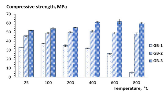 At the same time, the other two GB specimens did not show any effect on strength growth but rather a tendency to a reduction, up to 6%, in the case of GB-2 within the 400–800 °C temperature range or demonstrated up to 15% strength development for GB-3 within the 200–600 °C temperature range with further 2% strength reduction within the 600–800 °C temperature range (Figure 7). The structural integrity of these two specimens also looked good with a few cracks observed on the GB-2 specimens after 400, 600, and 800 °C of thermal exposure. The formation of cracks observed in the specimens was the result of thermal shrinkage [39], as well as disintegration processes related to the ongoing phase transformation. Although the specimens with visible cracks should not be subjected to compressive strength tests to evaluate mechanical performance, in this study, the specimens were tested, and the values were compared with others to estimate the residual strength after thermal exposure.