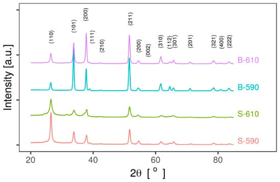 where I(h,k,l) is the measured relative intensity of the plane (h k l), I0(h k l) is the standard intensity of the plane (h k l) taken from literature (COD database, SnO2 COD ID: 9009082 [18]), and N is the number of reflections included in the calculations. The results for the four most intense XRD peaks are presented in Table 2. It is interesting that samples deposited at the lower temperature (S-590 and B-590) have significantly larger texture coefficients for (110), while B-590 and B-610 samples have larger (200) texture coefficients.