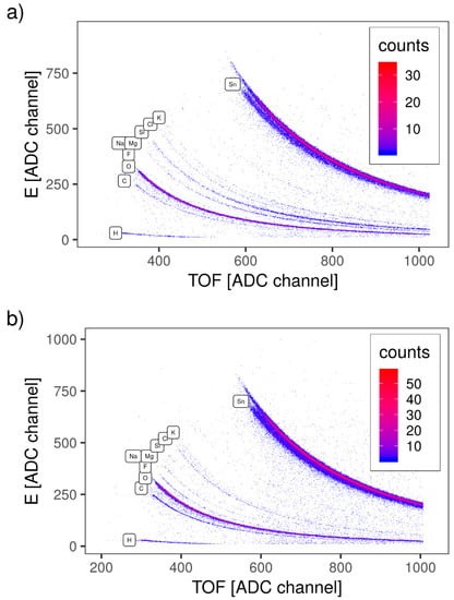 TOF-E map for SnO2 samples: (a) S-590 and (b) B-590. Traces of all detected elements are labelled.