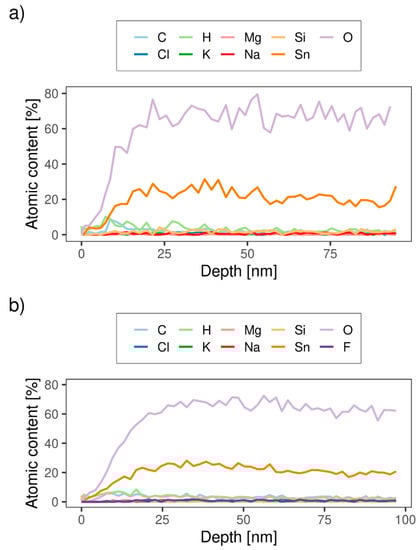 Small amounts of Si, K, Mg and Na, visible in TOF-E spectra (Figure 4a,b), could originate from the glass substrate, since the sample area is not fully covered by SnO2 film. Higher numbers of holes/cracks are expected for thinner samples (single-layer), which could explain the higher contribution of Si, K, Mg and Na in the sample S-590 (Table 3).