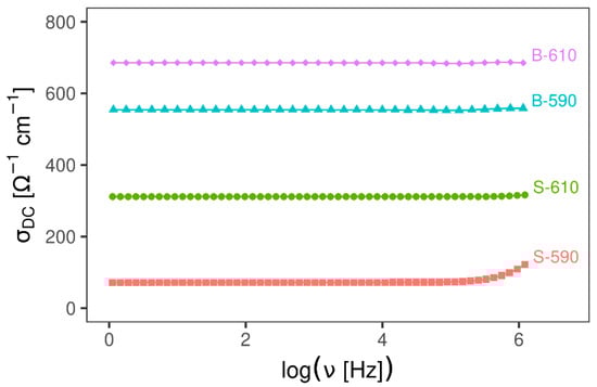 Impedance spectroscopy results (Figure 5) show that all samples have a very high electrical conductivity, independent of frequency in a wide frequency range indicating fast electronic transport. As expected, samples deposited in the two-step process (B-590 and B-610) have higher conductivity compared to samples deposited in the one-step process at the same temperature because of doping. Only sample S-590 shows a very small dispersion at the highest frequency range. For samples with higher conductivity, a dispersion phenomena is also expected at higher frequencies that are above the limits of the experimental setup. In addition, electrode polarisation effects are not observed for any of the samples, indicating the absence of ion transport contribution to the electrical conductivity.