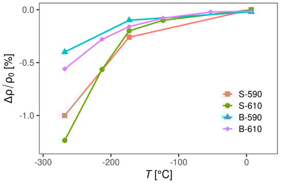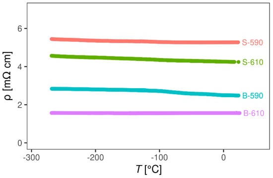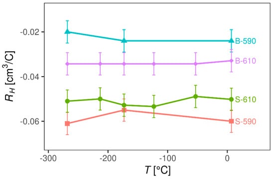 Figure 6 shows the DC resistivity of the four SnO2 thin films as a function of temperature. Interestingly, for all samples, the DC resistivity has a negligible temperature dependence from room temperature down to −269 °C, indicating a metallic type of charge transport. The high temperature measurements confirmed that the DC resistivity stays almost independent of temperature up to 150 °C. Hall effect measurements showed that the Hall resistivity is linear in a magnetic field up to 5 T and that the carrier density extracted from the Hall coefficient RH is in the range 1–3∙× 1020 cm−3, which is a typical value for SnO2 films. As expected, RH is negative, indicating n-type free carriers and doped samples (B-590 and B-610) have a higher electron density (2–3 × 1020 cm−3) than the undoped ones (S-590 and S-610) (1 × 1020 cm−3). As can be seen in Figure 7, RH for all samples also shows a negligible temperature dependence, indicating that all samples behave as heavily doped semiconductors and that for both, doped and undoped samples, the Fermi level lies either in the conduction band or in the region where the conduction band is mixed with impurity levels.