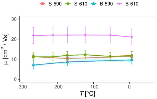 Having determined the DC resistivity ρ and the Hall coefficient RH, we are able to calculate the carrier mobility μ = RH/ρ, which is shown in Figure 8 for all four samples. Remarkably, charge carrier mobility is independent on temperature from room temperature down to −269 °C, in sharp contrast to behaviour found in conventional semiconductors, indicating the dominance of a non-trivial scattering mechanism.