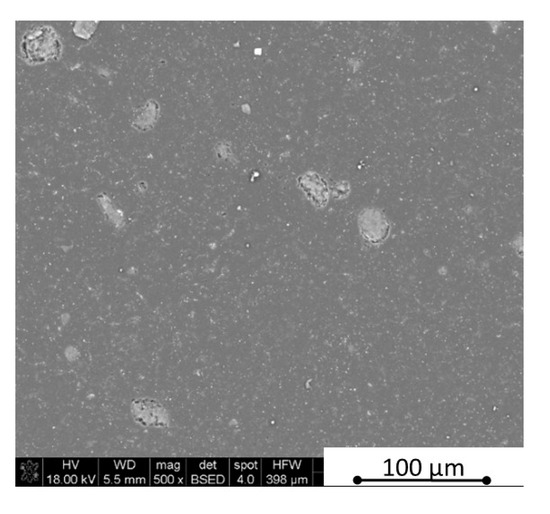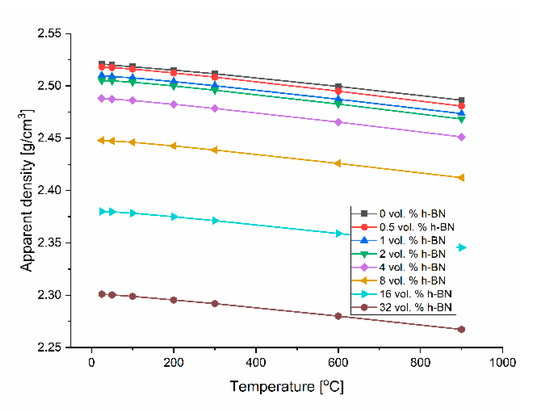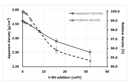 The apparent density results measured by the hydrostatic method is presented in Figure 3. The obtained data shows that dense materials can be obtained only with the addition of up to 8 vol.% of hexagonal boron nitride, which is higher than the literature data [13]. A further increase of h-BN content led to a decrease in the material density, which results from porous agglomerates of this phase (Figure 4). The density measurement error increases with the h-BN content, which is connected with the h-BN distribution, water adsorption to agglomerates, and a possible absence of h-BN after the HP graphite foil removal. The existence of hexagonal boron nitride agglomerates can lead to a decrease of the material friction coefficient [21,23]. Such agglomerates can strongly adsorb a large amount of water from the atmosphere, which was visible on the dilatometric curve changes as a negative jump on the curve. Such material required an additional time in the vacuum chamber in order to remove the adsorbed water before the final CTE analysis, which is described in a further part of this paper.