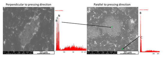 The XRD/Rietveld analysis showed that for the hot-pressed material with up to 2 vol.% there is almost no difference in the composite phase composition in relation to the material direction. The change of the selected phase concentration was noticeable for composites with 8–16 vol.% of hexagonal boron nitride due to the 2D phase orientation in the material as a result of applied pressure. For the highest content of h-BN solid lubricant, there was almost no difference due to the high content of even oriented h-BN agglomerates. In the case of a perpendicular direction, 1% of B2O3 was present in the samples with 32 vol.% of h-BN. It formed due to the oxidation of h-BN agglomerates. Some of the boron oxide can be present on the initial B4C powders grain surface, which cannot be detected due to its low amount. It can happen, for example, during the cutting or polishing process of the sample for XRD analysis. Also small quantity of tungsten borides were found with the used analysis detection level, about 0.4% in pure material and 1 vol.% h-BN composite. The WxBy tungsten boride is a result of the reaction between boron carbide and tungsten carbide impurities. The identification of the phase in the material microstructure was made by the SEM/EDS analysis and presented in Figure 6. The EDS analysis was made on the h-BN agglomerate in order to get a good element count. The dark grey colour belongs to boron carbide and the light grey to hexagonal boron nitride.