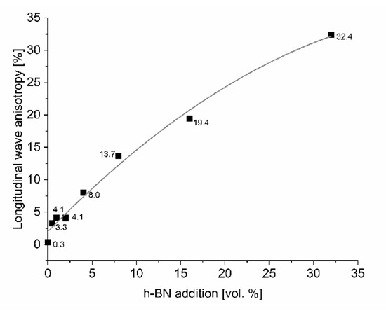 In order to confirm the anisotropic character of manufactured composites, the ultrasonic measurements of longitudinal wave velocity in relation to the material direction were done. The results are shown in Figure 11. The ultrasonic results show the anisotropy of wave velocity reaching 32% for 32 vol.% of h-BN. It can also result from the porosity of h-BN agglomerates, where the shape of pores has an important role.