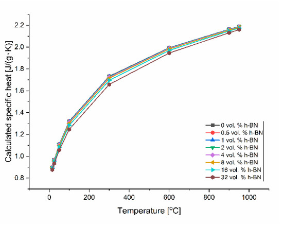 In the literature, there is no excessive information concerning the influence of 0–32 vol.% h-BN and the applied pressure of the hot-pressing process on the anisotropy of heat transport versus temperature in the boron carbide composite matrix. This is why the examples of thermal diffusivity data measured as a function of temperature and material direction are presented in Figure 18 and Figure 19. For lower contents of h-BN, there is a slight increase of heat transfer due to the high material densification above 99%, low content of flat defects (interphase boundary), and second 2D high conductive phase and low material anisotropy (Figure 11). A similar situation occurs when using a low quantity of graphene powder (GNP), where a small amount of 2D particles leads to an increase of thermal conductivity [23]. In the case of parallel direction to the pressing axis (Figure 18), at lower temperatures diffusivity decreases with the h-BN addition higher than 4 vol.%. It is caused by a higher material porosity connected mostly with h-BN agglomerates, increasing the concentration of flat defects (fractures in Figure 9 and Figure 10) and orientation of 2D particles. The thermal conductivity of a platelet shaped h-BN is above 200 W/(m∙K) in the plane direction and around 2 W/(m∙K) through the plane direction [24]. The authors of [24] confirmed that in the plane orientation of h-BN, larger thermal properties than in the perpendicular direction make the 2D particle plane. They also showed that very small particles and large agglomerates tend to orient less, therefore, it can also have an influence on thermal properties, which is its value in our case in perpendicular direction to the pressing axis. The scattering of phonon at boundaries of the studied samples will cause the heat transfer to decrease mainly in perpendicular direction to the pressing axis due to the material anisotropy. For higher temperatures (900 °C) all curves reach values between 2.3 and 2.6 mm2/s. The results of thermal diffusivity measured in perpendicular direction show higher values for the higher h-BN content in a whole range of temperatures. This parameter decreased with the temperature more slightly than in the parallel direction. At 900 °C, increasing the h-BN content thermal diffusivity changes from 2.4 to 3.8 mm2/s is visible in Figure 19.