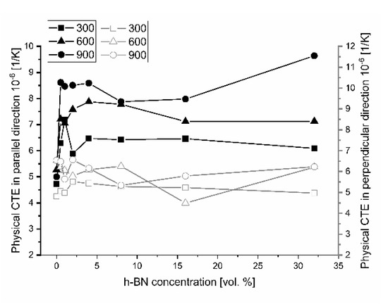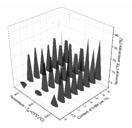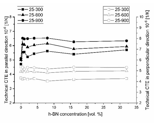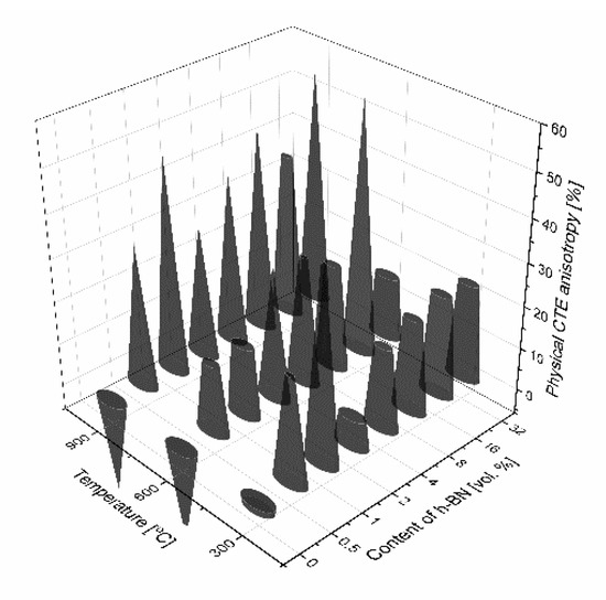The results of thermal expansion coefficient shown in Figure 14 and Figure 15 indicate high anisotropy material linear changes versus material direction. A sudden increase of the technical and physical CTE value in the perpendicular direction begins for 0.5 vol.% of the h-BN content in the composite. A higher addition of h-BN does not significantly change the technical CTE. For the parallel direction to the pressing axis, it stays on the level of 5.4 × 10−6 1/K for 25–300 °C measurement range, 5.9 × 10−6 1/K for 25–600 °C measurement range, and 6.3 × 10−6 1/K for 25–900 °C measurement range. For the perpendicular direction to the pressing axis, it is as follows: 4.2 × 10−6 1/K for 25–300 °C measurement range, 4.9 × 10−6 1/K for 25–600 °C measurement range, and 5.3 × 10−6 1/K for 25–900 °C measurement range. The dilatometric analysis showed the material linear changes fluctuation in the case of physical CTE, which varied in relation to the h-BN content and especially the high temperatures visible for 32 vol.% h-BN at 900 °C. The calculated data of the technical and physical CTE anisotropy are illustrated in Figure 16 and Figure 17. For high temperatures, the physical CTE anisotropy stays on the level of 50%. For lower temperatures, it is mostly between 20% and 30% (Figure 17). For the technical CTE, all the measured temperature ranges are between 20% and 30% (Figure 16).
