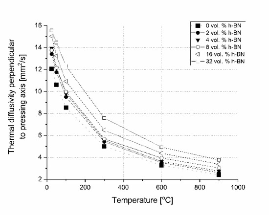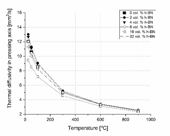 Thermal diffusivity versus temperature and h-BN content in the pressing direction.