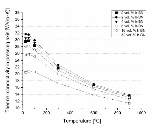 Thermal conductivity versus temperature and h-BN content in pressing direction.