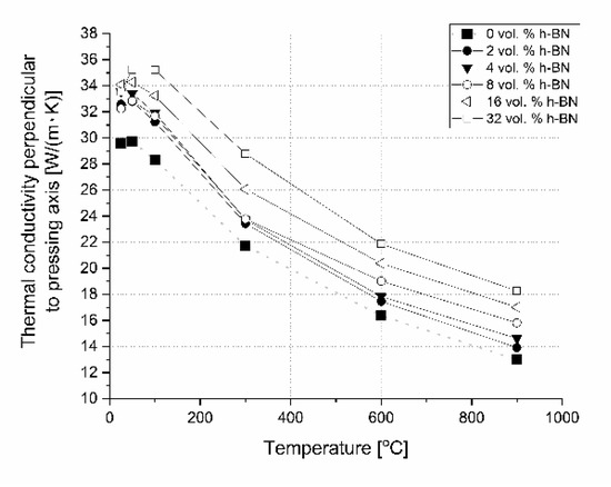 Thermal conductivity versus temperature and h-BN content perpendicularly to the pressing direction.