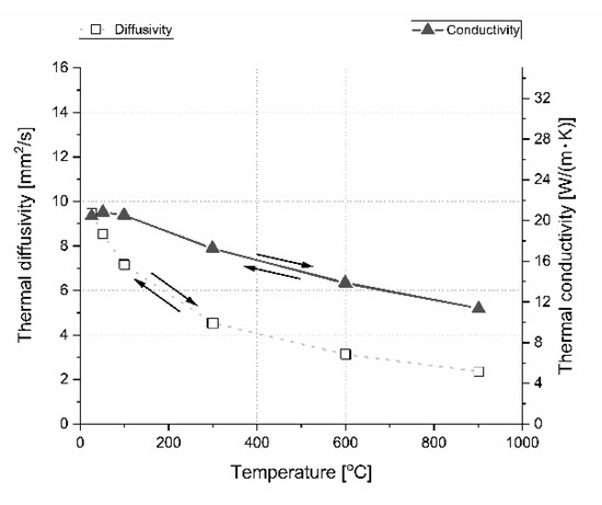 For the onset of laser processing description, the heat transfer properties at room temperature are very important (Figure 24). During the process, material properties at higher temperatures become much more interesting. The change of thermal diffusivity and conductivity at 900 °C is illustrated in Figure 25, which is the approximate temperature that stays around the laser-treated place for a short time after the interaction between the laser and sample.
