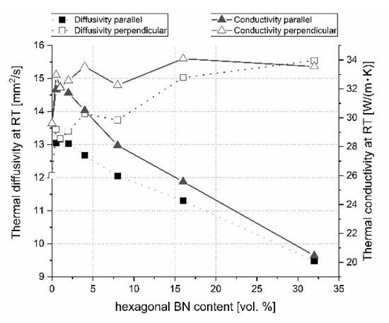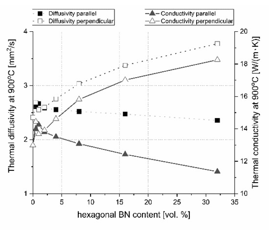 The addition of hexagonal boron nitride will lead to an anisotropy of the thermal conductivity/diffusivity as a result of the dispersed particles and pores orientation in the material microstructure. For room temperature (RT) conditions in the pressing axis direction, an increase of h-BN particles will cause a strong decrease in thermal properties especially in the case of its higher h-BN content. A different situation occurs in the perpendicular direction where the heat transfer is faster. A similar situation can be met in high temperatures. There is a large thermal properties anisotropy at low and high temperature which increased with the higher h-BN content in the composites, as clearly visible in Figure 24 and Figure 25. This situation can have an influence on the material treatment, which is presented in the next part of this paper.