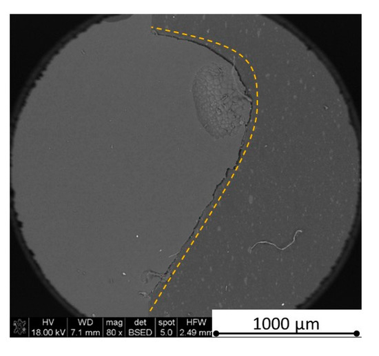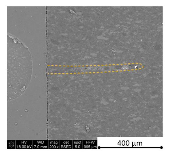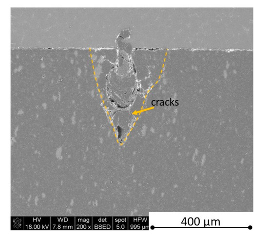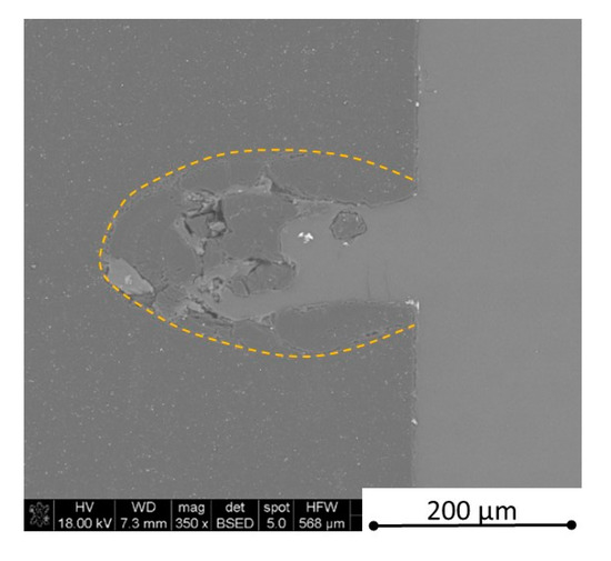 The increase in h-BN content above 8 vol.% causes the change of the laser cut shape, which is presented in Figure 30 and Figure 31. For higher h-BN concentrations, the thermal anisotropy and h-BN agglomerates of the located porosity have a significant influence in laser processing. In perpendicular direction to the pressing axis (in-plane), the thermal diffusivity/conductivity is about 60% higher than in the pressing axis direction. It causes a heat transfer limitation in the out-of-plane direction and results in only 250–320 microns of processing depth for the rough surface sample. In this case, the ablation width is about 100 microns due to the heat transfer to the zone sides (Figure 32). There are no large cracks most likely due to the higher material porosity (Figure 3). Moreover, in the case of the low roughness polished sample with 32 vol.% h-BN, narrow, crack free, and deep laser cuts were observed (Figure 36 and Figure 37). Due to the argon flow some material stays inside the cut, but it can be removed by use of short pulse laser processing and a vacuum or under pressure conditions. In most of the laser treatment cases, the anisotropy of thermal properties leads to deeper and narrower cuts. For a low concentration of h-BN, cuts have the shape of a droplet.
