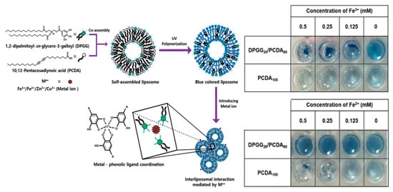 - Park, K.H.; Yang, S.Y.; An, B.-S.; Hwang, D.Y.; Lee, J.H.; Kim, H.S.; Seo, S. Metal Ion-Mediated Interliposomal Aggregation of Polydiacetylene Liposomes Incorporating a Phenolic Lipid. J. Nanosci. Nanotechnol. 2019, 19, 3755–3761. [Google Scholar] [CrossRef]