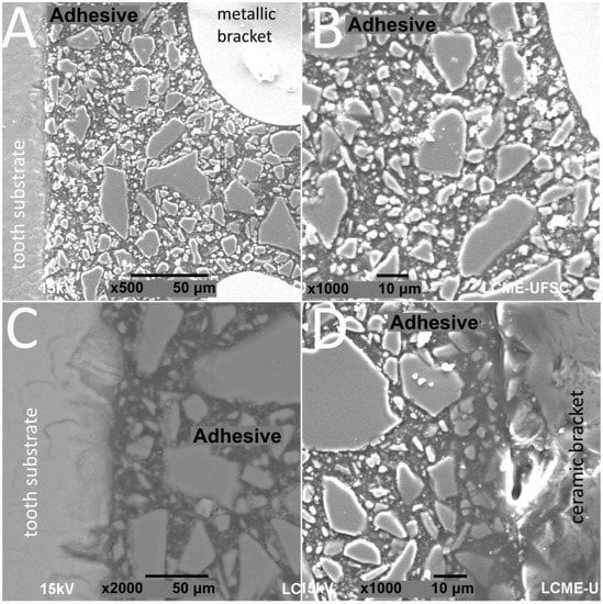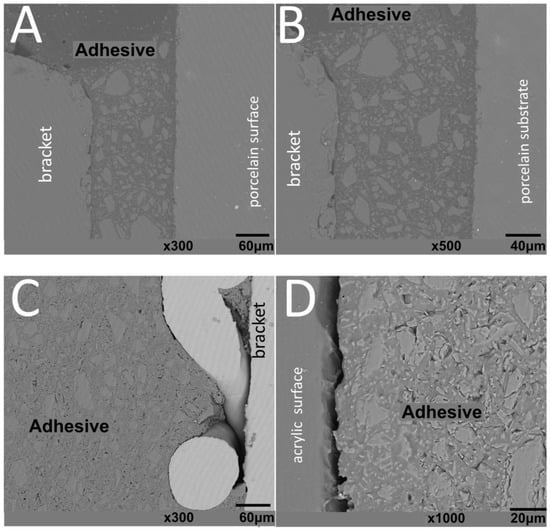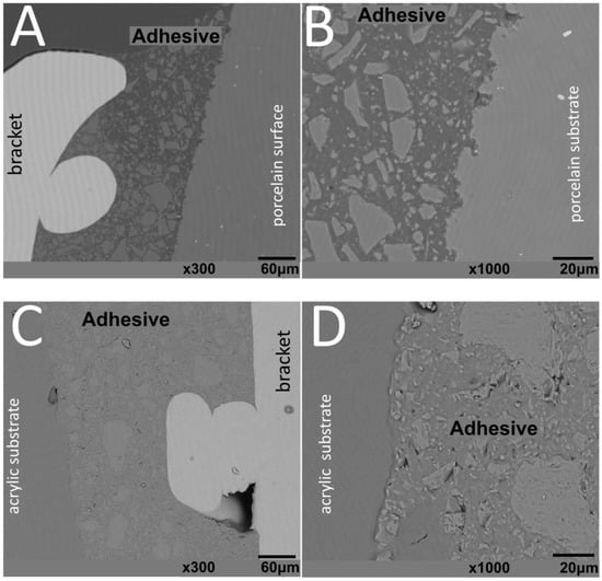 SEM images of metallic brackets bonded to (A,B) glass–ceramic or (C,D) acrylic surfaces.