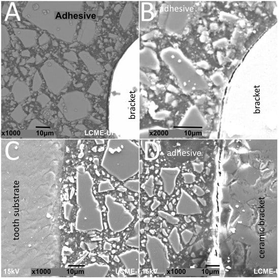 SEM images of interfaces involving brackets, adhesive, and the human enamel, glass–ceramic, or acrylic surfaces before and after thermal cycling are shown in Figure 2, Figure 3, Figure 4 and Figure 5.