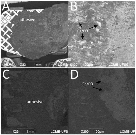 SEM images the bracket base after debonding from tooth enamel surfaces. EDS detected Ca and P embedded in the adhesive. Surface of the adhesive after debonding from (A,B) stainless-steel and (C,D) ceramic brackets.