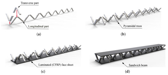 Fabrication process of a sandwich beam: (a,b) aluminum pyramidal truss core assembly; (c,d) a sandwich beam assembly with laminated face sheets and pyramidal core. CFRP: carbon fiber reinforced plastic.