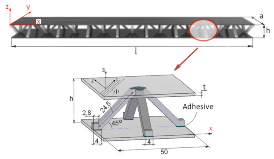 The numerical modeling of various types of structures has become an indispensable part of engineering design work. The problems that are related to the analysis of structures made of metal, timber, or composite materials are often addressed through numerical analyses. Such analyses are particularly useful when a structure becomes increasingly anisotropic, which is often the case with composite structures. There is a large variability of types of composite structures. Consequently, numerical tools for analyzing composite structures’ behavior are constantly being developed and improved upon. One type of these structures is a sandwich composite with a pyramidal truss core. This particular type of composite has recently gained the attention of the scientific community due to its engineering advantages [1,2,3,4,5]. Among these advantags, they possess high specific bending stiffness, weight efficiency, and good thermal and acoustical insulation [6]. The static and dynamic behavior of sandwich structures is governed by the configurations of the parent components (face sheets and core), as well as their constituent materials’ properties. The face sheets of these structures mainly contribute to the bending stiffness, whereas the core mainly contributes to the shear stiffness. The manufacturing of such composites is realized while using adhesive joints between the core and the face sheets [7]. If the parent materials are made of metal, the joints are mostly manufactured by brazing or laser welding [8]. However, if the parent components are made of different materials, e.g., fiber-reinforced laminated face sheets and aluminum core, then the joints must be manufactured by the application of an adhesive material such as epoxy resin. For the first case, it is customary to assume that the brazed or welded joints possess similar material properties to those of the parent material and, therefore, there is no need for special modeling of the joints. For the latter case, the adhesive material’s properties differ from those of the parent components. This may result in a significant mutual displacements between them. For such a case, it is important to properly model the adhesive joint in order to capture additional effects that are associated with the mutual movements of the parent components. The current state-of-the-art regarding the modeling of sandwich beams with a pyramidal truss core is mostly governed by two approaches, namely equivalent modeling [9,10] or the finite element method (FEM) [11,12]. The first approach has usually been used for static analyses including linear and non-linear responses as well as fracture analysis. The equivalent model of the sandwich beam is mostly derived from the geometrical characteristics of the core and the stiffness parameters of parent components. Such models are suitable for analyzing full metal sandwich beams as well as different combinations of parent components, such as metal face sheets with a laminated carbon fiber composites (CFRP) truss core or CFRP face sheets with a metal truss core. However, for this kind of model, the adhesive joints’ compliance is not accounted for. For this reason, this type of structural modeling does not provide any information on the local behavior of the sandwich beams. The FEM approach has been used for either static or dynamic (vibration and crashworthiness) analyses. It allows for the detailed modeling of structures. However, this approach requires careful planning of the model development. It must start with proper assumptions made regarding the geometry, element type, material models, interactions between parts that are in contact (for the current case parent components), number of elements, type of solution, etc. The most attention is commonly given to the exact representation of the geometry of the beams, as seen in the up-to-date literature. The mutual contact between parent components is mostly defined as a tied contact (no mutual displacements between parent materials are allowed) [13] or by the introduction of a mathematical model for adhesive joints (small displacements between parent materials are allowed) [14]. However, the motivation for such approaches has been not justified, unless the parent components are made of the same material [15]. There is also a number of research studies devoted to the sandwich beams with an adhesive layer made of viscoelastic layer [16,17,18]. However, for the above cases, the viscoelastic layer was designed in order to enhance damping behaviour only, rather than the bound between the face sheets.