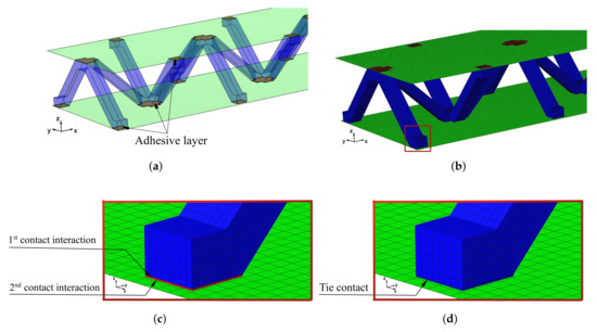 An adhesive joint between the pyramidal truss and face sheets has the form of a thin layer of an additional material. Consequently, the shell elements were selected for the discretization of the adhesive layer. For this purpose, a continuum hybrid solid-shell elements SC8R was used. The SC8R elements discretize an entire three-dimensional body. They only possess displacement degrees of freedom. From a modeling point of view, the SC8R elements look like three-dimensional continuum solids, but they have kinematic and constitutive behavior that is similar to conventional shell elements. The advantage of the SC8R elements is that they exhibit fast element convergence along the thickness direction. For the adhesive layer, one element in the thickness direction is sufficient. The SC8R elements also allow for two-sided contact with changes in their thickness, which makes them more suitable for the modeling of contact interactions. The adhesive layers were only modeled in the spots where contact between the truss and face sheets existed (adhesive joints).