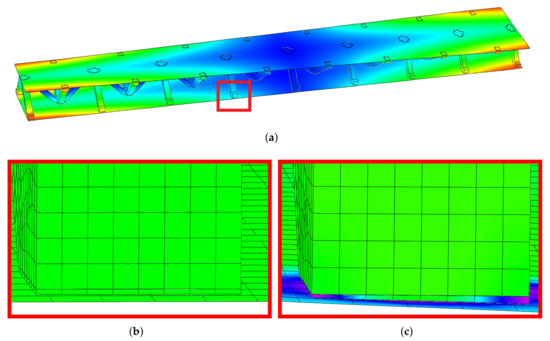 Numerical results: (a) Example of the deformed mode shape (mode 1); (b) undeformed state of the adhesive layer; (c) deformed state of the adhesive layer.