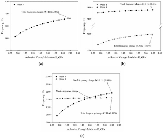 Sensitivity study of the eigenfrequency change due to the adhesive E modulus variation: (a) Mode 1; (b) Mode 2 and 3; (c) Mode 4 and 5.