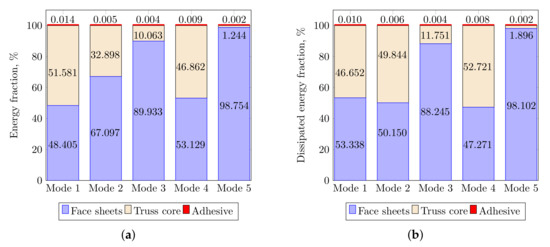 Two FEM models of the sandwich beams were developed for the numerical prediction of the modal parameters. One model (FEM(I)) accounted for a layer of the adhesive material in order to connect parent materials (laminated face sheets and the aluminum pyramidal truss core). The second model (FEM(II)) was simplified by the elimination of the adhesive layer. The parent materials were connected by tie contact definitions. Both of the models were subjected to frequency analysis in order to extract the eigenfrequencies and corresponding mode shapes. Significant result discrepancies were noticed between the developed models as well as versus the experimental results, as given in Table 8. The eigenfrequencies for the FEM(II) model were overestimated, which is a consequence of higher overall beams’ compliance values due to the tie contact definitions. The results given for the FEM(I) model were far more consistent with the experimental results. This was a consequence of the beam’s compliance reduction due the deformation of the adhesive material. An important issue is that a change in the mode shape’s appearance was noticed for the FEM(II) model. As given in Table 6, the last two modes interchanged. Such a situation is not acceptable if the dynamic behaviour of a structure is the main focus for the designers, or if the model is intended to be used for optimization purposes. The phenomenon of the modes sequence change was also captured from the sensitivity study. As given in Figure 7c, the increase of the adhesive modulus considerably changes the eigenfrequency of the mode 4, but has negligible effect on the mode 5. As a result, the two values cross at a point were the modes sequence changes. The increase of the adhesive modulus brings all the eigenfrequencies values close to the FEM(II) solution. However the rate of change is not the same for all of the considered modes. As for the modal loss factor predictions, the proposed procedure for the modal damping prediction was successfully validated with the available literature. The stress and strain components calculated for the FEM(I) model were then used for the prediction of the modal loss factors of the sandwich beams. The strain energy for a single shell finite element of the laminated face sheets was calculated while using Equation (6). It must be pointed out, that Equation (6) was applied for each integration point throughout the element thickness. The element’s strain energy was taken as an average value from all integration points. For that reason, it is recommended to define at least five integration points throughout the lamina thickness. The fractions of the energies stored in each parent component as well as the fractions of the dissipated energies were calculated and are given in Figure 8. Following the results, the contribution of the adhesive layer to the overall beam’s strain energy is negligible for each mode of vibration. Accordingly, the fraction of the dissipated energy due to the material of the adhesive layer is also negligible. Hence, the material that is used for the adhesive joint (epoxy adhesive in the present study) does not considerably contribute to the total beam’s energy dissipation. Nevertheless, as given in Table 9, a good agreement was achieved between the numerical prediction and the experimental results. The average difference of the results was found to be 11.58%. However, the predicted modal loss factor for mode no. 4 differed significantly from the experimental results. In the authors’ opinion, this might be the reason for closely spaced modes (see the FRFs of the beams in Figure 5). For such a case, a more sophisticated approach for modal parameters extraction shall be used. The average results’ difference could also be reduced if the measurements were performed in a vacuum chamber. The surrounding air may have significantly affected the damping assessment, as the examined sandwich beams were open cell type structures.
