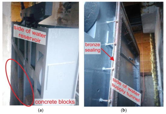 View of the sluice gate: (a) from the side of the water reservoir and (b) from the side of the water tunnel.