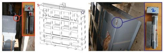 In practice, there are cases when information is not available to perform relevant analyses regarding the material used, especially its chemical composition, material properties, etc. This is especially the case with older, earlier designed and manufactured structures. In such cases, material characteristics are most often determined on the basis of analyses of material samples. In our case, material samples were taken from two different locations (Figure 3). These locations were chosen to maintain integrity, functionality and strength of the sluice gate.